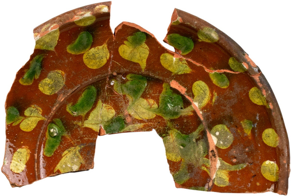 | 5c decoratie | inwendig gele slib (stippen), deel van de stippen is koperoxidegroen |