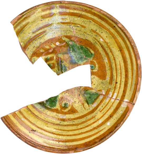 | 5c | inwendig slibversierd: gele slib op vlag (concentrische cirkels), bloem (?) van gele slib en koperoxidegroen op spiegel |