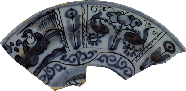 | 5c | inwendig kobaltblauw: vlakverdeling met Aziatisch figuur en stilistische bloemen op vlag, onderzijde kobaltblauw: strepen en cirkels blauw |