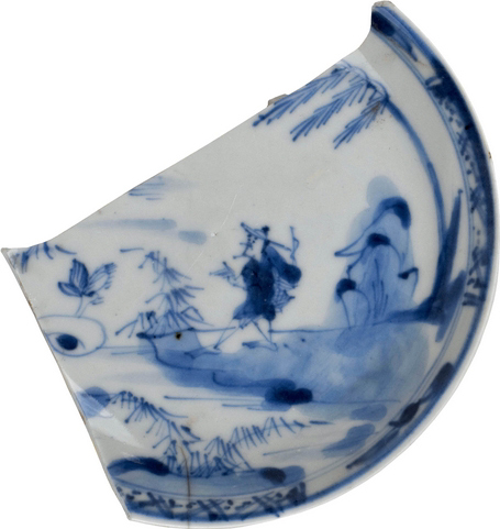 | 5c | inwendig kobaltblauw: geometrische band langs rand met Aziatisch landschap op spiegel: oever met water, riet, boom, rotsen en visser met hoed/net/hengel onderglazuur blauw |