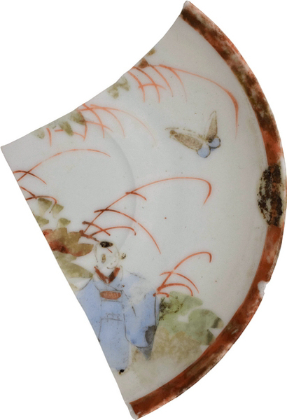 | 5c decoratie | inwendige beschildering: figuur in lichtblauwe kimono met daaromheen groene struiken met rode pluimen, blauwe/grijze vlinder, rode band langs rand polychroom |