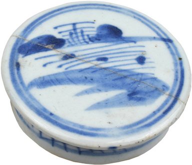 | 5c decoratie | uitwendig kobaltblauw op sluitrand: hekwerk/landschap, op bovenzijde: dubbele cirkel met daarbinnen landschap onderglazuur blauw |