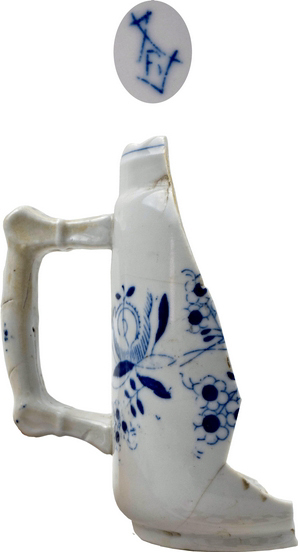 | 5c decoratie | uitwendig kobaltblauwe decoratie: 'zwiebelmuster' motief onderglazuur blauw |