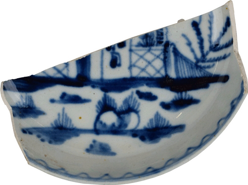 | 5c | inwendig kobaltblauw: geometrisch motief langs rand, landschap met huisje op spiegel blauw |