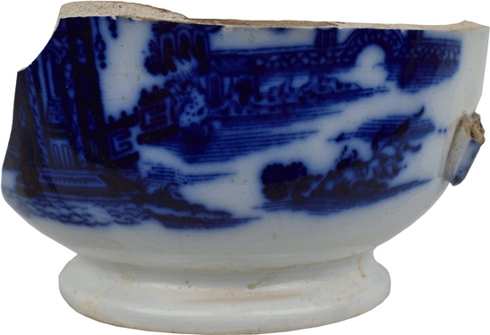 | 5c | vloeiblauwe decoratie inwendig op spiegel en uitwendig op wand: landschap met Aziatische gebouwen blauw |