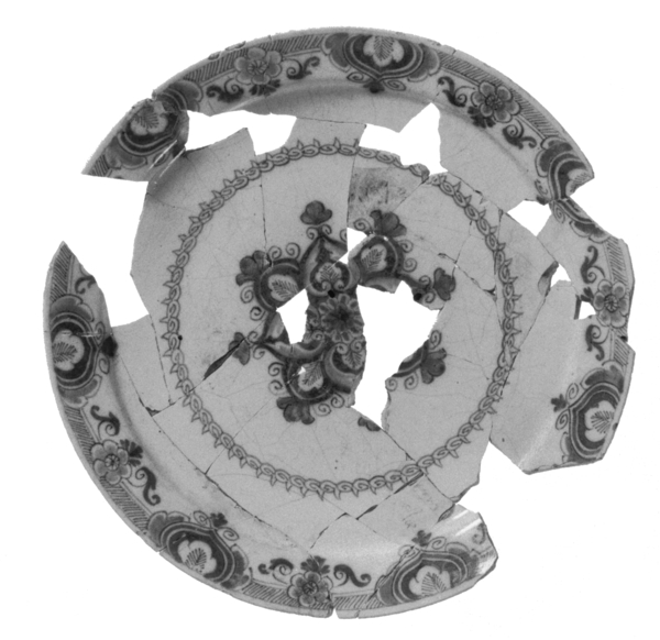 | 5c decoratie | blauw, vlag: baluster van bloemen en bloembladen; spiegel: repeterend achtzijdig bloem werk inwendig blauw |