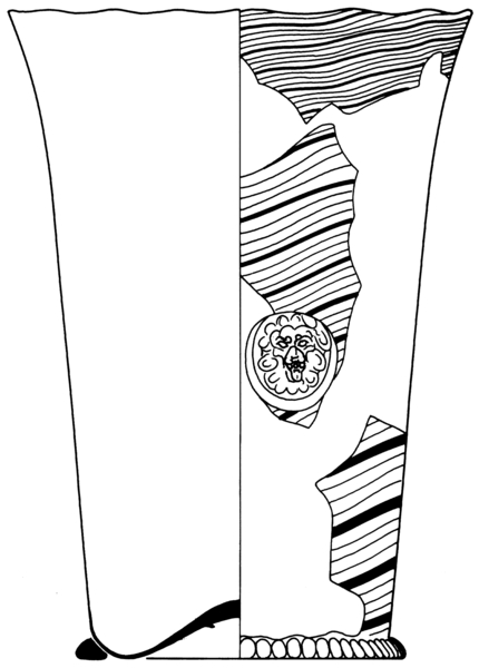 | 4b | cilindrische of licht conische beker met spiraalvormig deels ingesmolten of deels ingesmolten 'Vetro à fili', uitstaande lip, opgestoken bodem met pontilmerk en voetring |