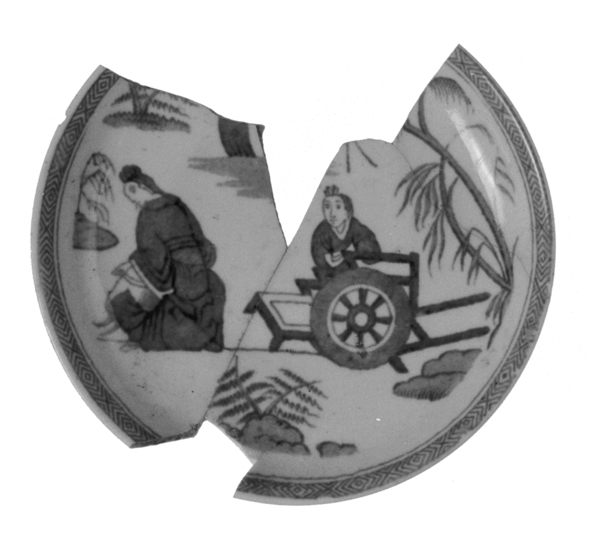 | 5c | inwendig: onderglazuur blauw: drukdecor: Chinezen met wiel onderglazuur blauw |