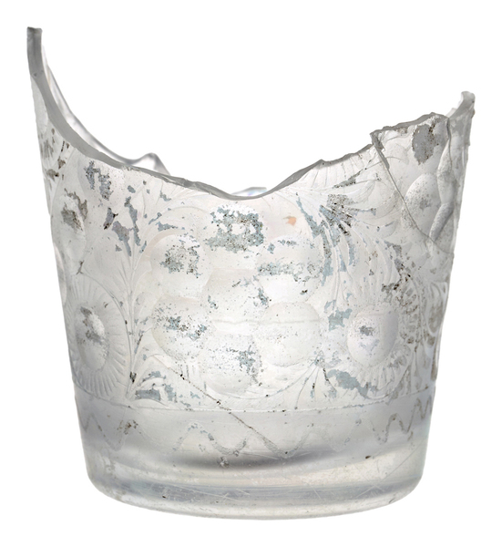 | 4b | dikwandige conische beker met geslepen facetpatroon (d), verdikte bodem met standvlak, met (eventueel weggeslepen) pontilmerk |