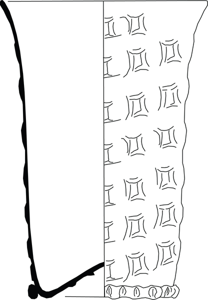 | 4b | cilindrische of licht conische beker met wafelpatroon, uitstaande (a) of rechte (b) lip opgestoken bodem met pontilmerk, voetring |