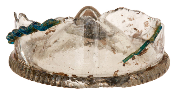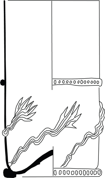 | 4b | cilindrische beker met horizontale draad rondom en daaronder drie of vier diagonale draden in klauw eindigend, opgestoken bodem met pontilmerk, geribde voetring |