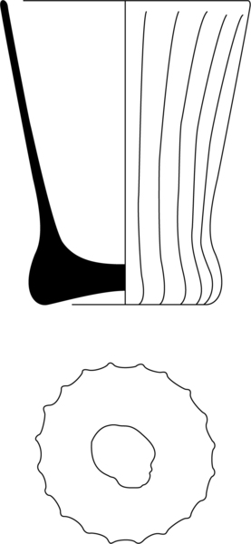 | 4b vorm | dikwandige getailleerde beker met verticale vlakken- of ribbenpatroon, verdikt standvlak met (eventueel weggeslepen) pontilmerk |