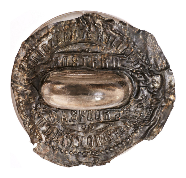 | 5d | merk: W A SPOOR CULEMBORG, stopfles met stop en loden afsluiting; tekst loden afsluiting: VERDUURZAAMDE HOLLANDSCHE MOSTERD W.A.SPOOR JR CULEMBORG HOLLAND contactvorm mosterd |