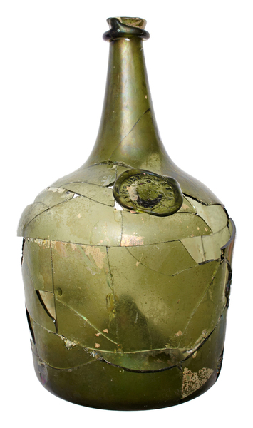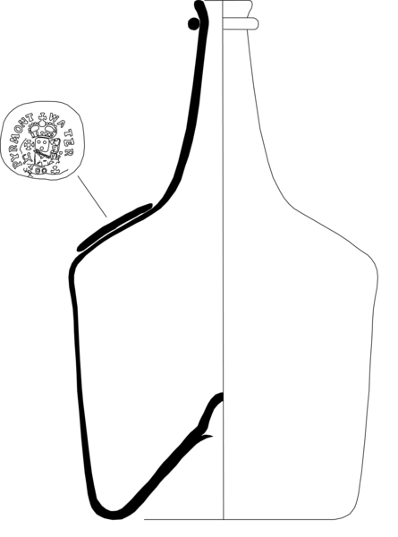 | 4b | brede lichtconische mineraalwaterfles met lange toelopende hals met licht uitbuigende lip, ook met Pyrmontwater zegel, hoge in een punt opgestoken bodem met pontilmerk |