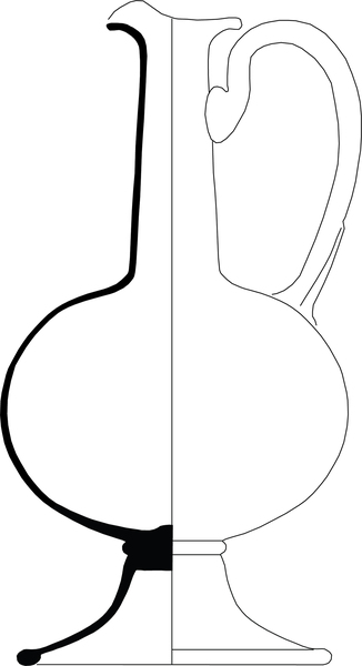 | 4b | bolvormige kan met lange cilindrische hals en oor, geknepen schenklip, hoge voet met draad op overgang naar buik, pontilmerk |