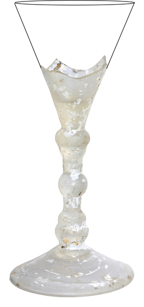 | 4b | klok- of trechtervormig kelkglas met dikwandige bodem, holle of (deels) massieve stam met drie geledingen met nodus of paddestoelvormige nodus met luchtbel, voet met pontilmerk |