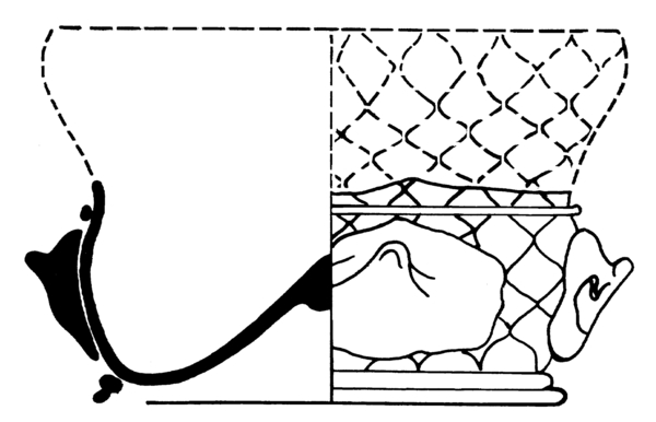 | 4b vorm | lage cilindrische licht buikige koolstronk met toegebogen lip, horizontale rij noppen, puntnoppen of opgerichte puntnoppen, ook met patroonvorm, opgestoken bodem met pontilmerk, voetring |