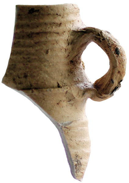 | 4b | lage bekervormige kan met kraag op de halsaanzet, iets verdikte hals, rechte rand, op standring |