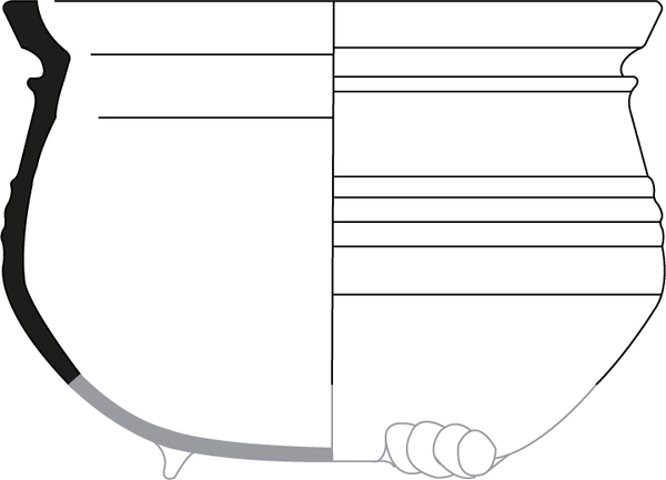 | 4b vorm | bolle kom met ingesnoerde hals en zware, vierkante rand, zonder oor of steel, lobvoeten |