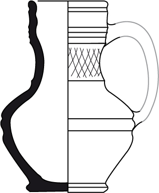 | 4b | peervormige kan met ribbels / groeven op grootste buikomvang, ribbel op halsaanzet, uitkragende, bijna cilindrische kals met ribbels, standvoet (imitatie steengoed kan) |