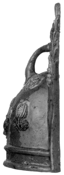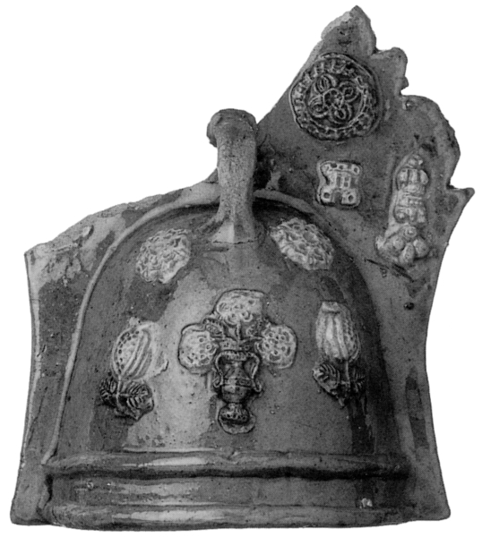 | 5c | uitwendig: slibdecoratie met witte klei; gestempelde wit aardewerken appliques, soms groen geglazuurd: granaatappel, bloemenvaas, rozet, torentje, pilaster, rozet-medaillon |