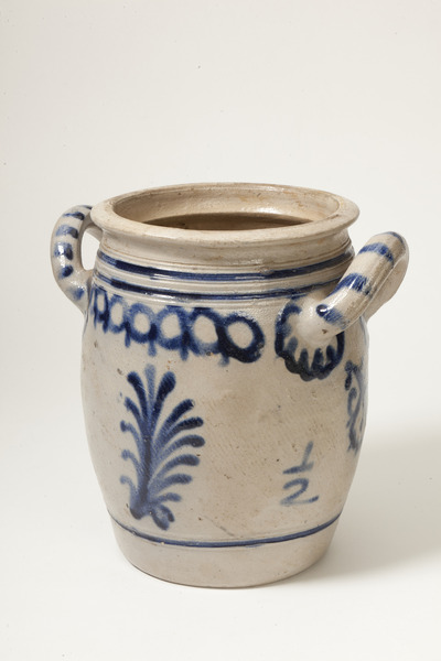 | 5c decoratie | blue stripes surrounding the top and low parts of the pot, vegetal and abstract motifs, dot decoration in the handles. |