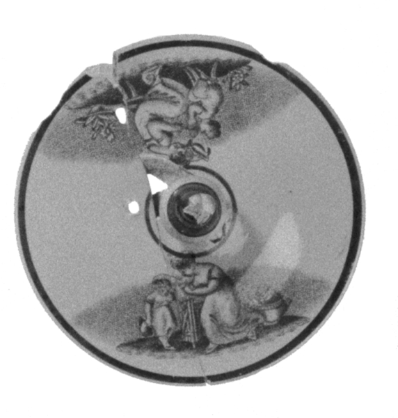| 5c decoratie | drukdecor in zwart; uitwendig: geel onderglazuur: moeder met kind zwart, geel |