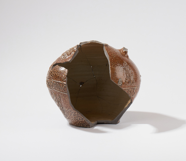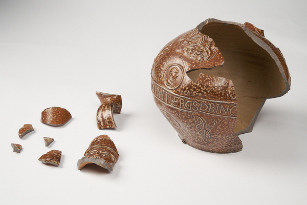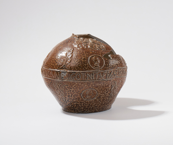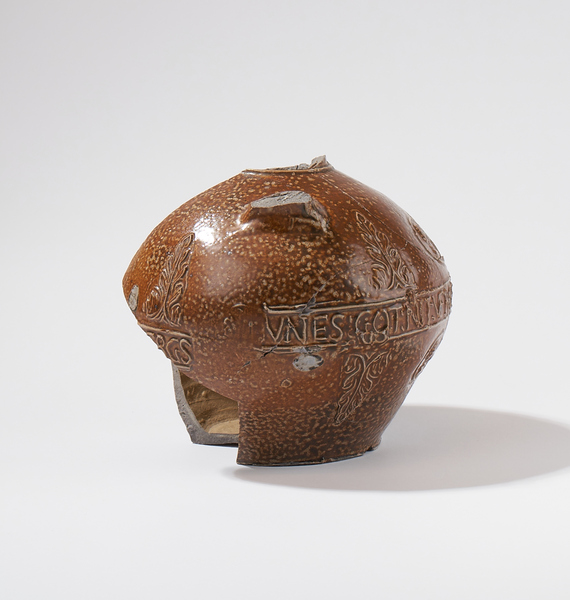 | 5c decoratie | baardman, applique op de hals, tekst op buik Drinck vDN EST GOTS NIT VERGES, appliquen van acanthus bladeren en medallions met hoofd. |