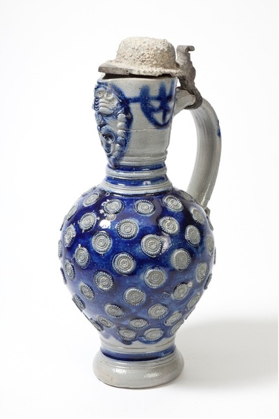 | 5c | Bloemen-appliques in rondjes op buik (madeliefjes?) en maskeron-applique op hals; kleine krul onder handvat uitwendig blauw |