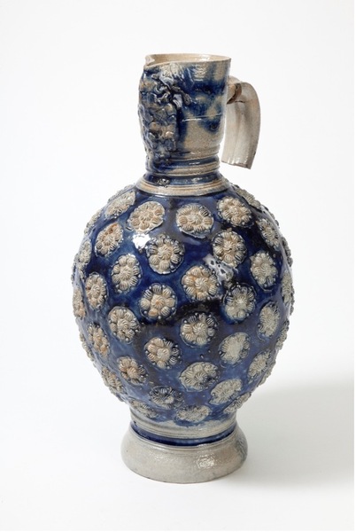 | 5c decoratie | Bloemen-appliques op buik gemaakt uit verschillende rondjes en maskeron-applique op hals; kleine krul onder handvat uitwendig blauw |