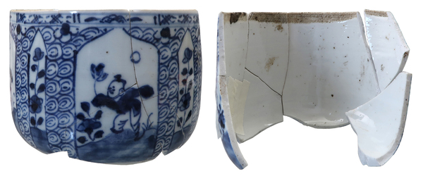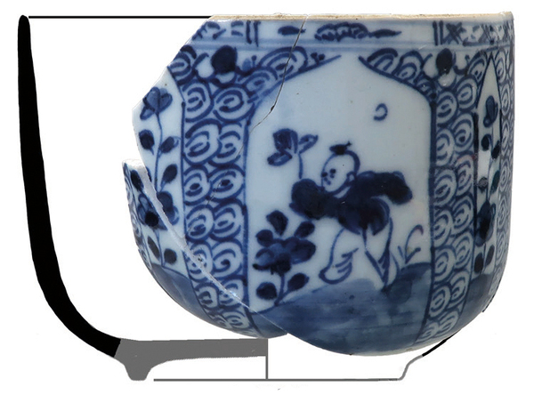 | 5c | versiering in vakken: zotjes en bloemen; in de omlijsting : rondjes/krullen; buitenzijde rand: geometrisch versierd onderglazuur blauw |