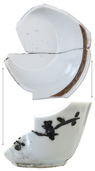 | 5c decoratie | beschildering in goud, groen, blauw en rood? (zwart verkleurd), vogel op tak; binnenzijde: band onder rand polychroom |