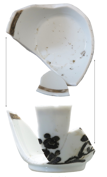 | 5c | beschildering in goud, groen, blauw en rood? (zwart verkleurd), bloemmotief; binnenzijde: band onder rand polychroom |