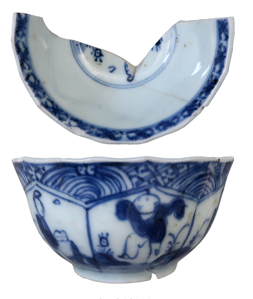 | 5c | versiering in vakken: zotje en balspel spelende dame; geometrische versiering op rand (binnen en buiten); binnenin medaillon onderglazuur blauw |