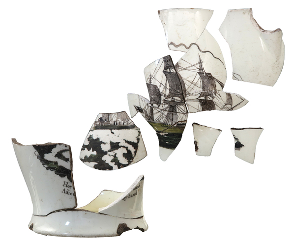 | 5c decoratie | bovenglazuur: schip (zwart, geel, groen, deels afgebladderd; spreuk: "Her....Land, Adieu....my hand" polychroom |