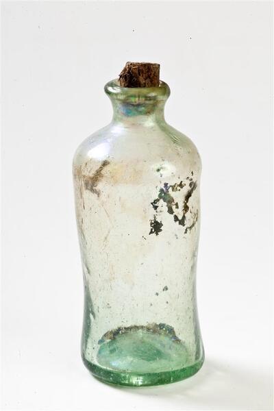 | 4b | kleine cilindrische fles met afgeronde schouder met korte hals en uitstaande, verdikte of omgeslagen lip, met smalle hals (a), vormgeblazen of contactvorm met naden, opgestoken bodem, standring of standvlak met of zonder pontilmerk |