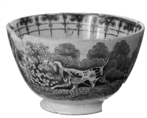 | 5c decoratie | inwendig: drukdecor in blauw: baluster; uitwendig: drukdecor in blauw: ree en jachthond blauw |
