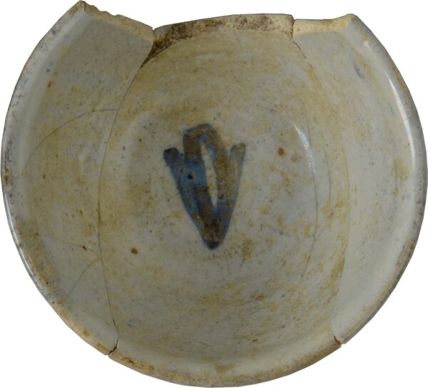 | 5c | uitwendig pseudo Chinees landschapje met persoon in bootje, daarboven randfries met bloemstukjes onder de rand, inwendig gestileerde tulp op bodem blauw |