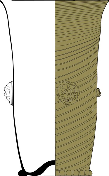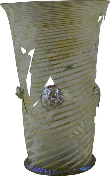 | 4b | cilindrische of licht conische beker met spiraalvormig deels ingesmolten of deels ingesmolten 'Vetro à fili', uitstaande lip, opgestoken bodem met pontilmerk en voetring |