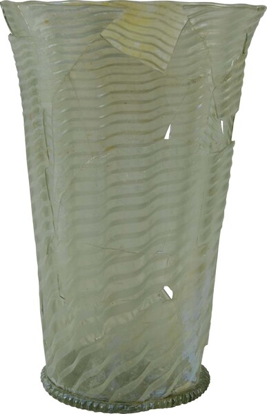 | 4b | cilindrische of licht conische beker met spiraalvormig deels ingesmolten of deels ingesmolten 'Vetro à fili', uitstaande lip, opgestoken bodem met pontilmerk en voetring |