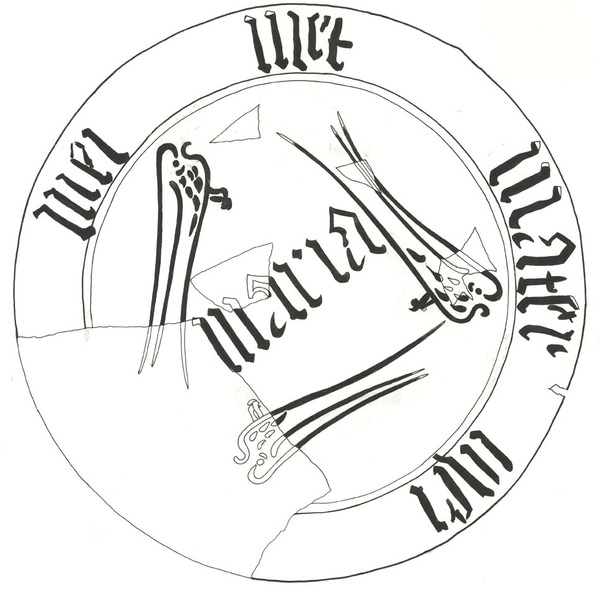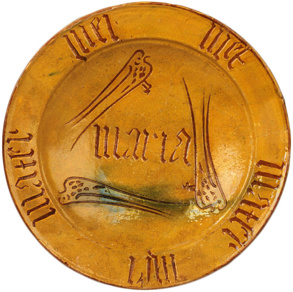 | 5c | inwendig slib met sgrafitto: drie duiven en tekst 'Maria', op vlag tekst 'mei met mater mei mater' |