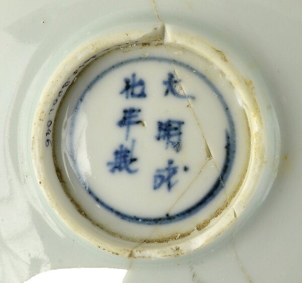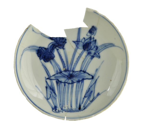 | 5c | spiegel: waterlelie/lotus partij; op rand concentrische cirkel onderglazuur blauw |