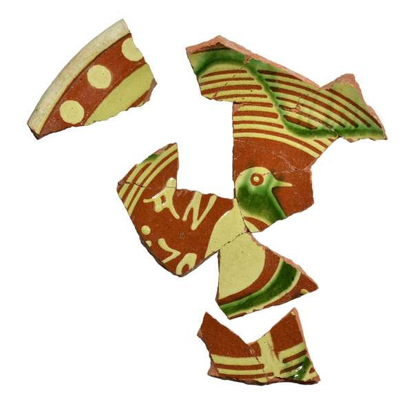 | 5c decoratie | concentrische cirkels en stippen in witte slib, golflijn met koperoxide, vogel met jaartal "AN(NO) 170(?)" |