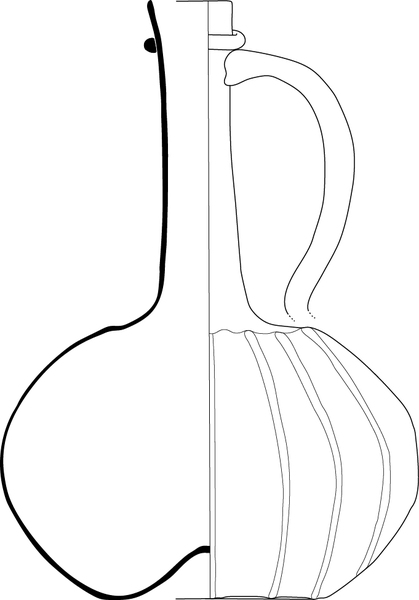 | 4b vorm | bolvormige fles met lange hals en met oor, met draad ruim onder de lip, met opgelegde zware verticale ribben, opgestoken bodem met pontilmerk |