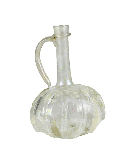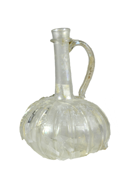 | 4b | bolvormige fles met lange hals en met oor, met draad ruim onder de lip, met opgelegde zware verticale ribben, opgestoken bodem met pontilmerk |