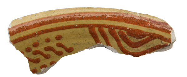 | 5c decoratie | ringeloordecoratie in rode slib: concentrische boogjes, liggende s-jes en stipjes |