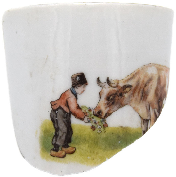 | 5c decoratie | polychroom decalcomanie: boerenjongen met koe, goudluster op rand, groen filet boven bodem |