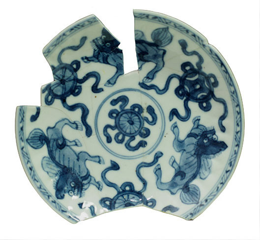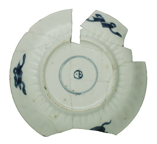 | 5c decoratie | centraal motief: brokaten bal, daaromheen drie boeddhistische leeuwen (foo honden) met een brokaten bal; op onderzijde: drie boeddhistische symbolen onderglazuur blauw |
