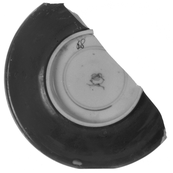 | 5c | vlag: onderglazuur blauw: visgraat, bloemen; spiegel: onderglazuur blauw: chrysant en vlinder, uitwendig buin onderglazuur blauw, bruin |