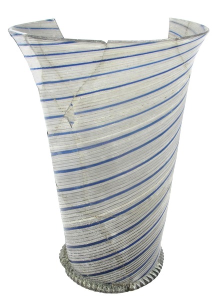 | 4b | cilindrische of licht conische beker met spiraalvormig deels ingesmolten of deels ingesmolten 'Vetro à fili', uitstaande lip, opgestoken bodem met pontilmerk en voetring |